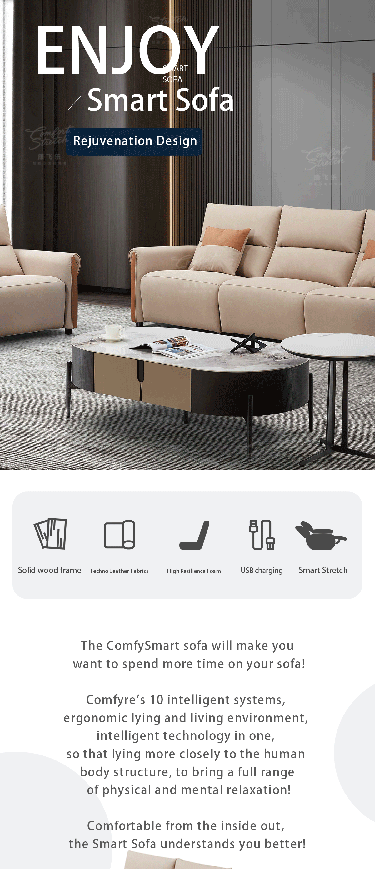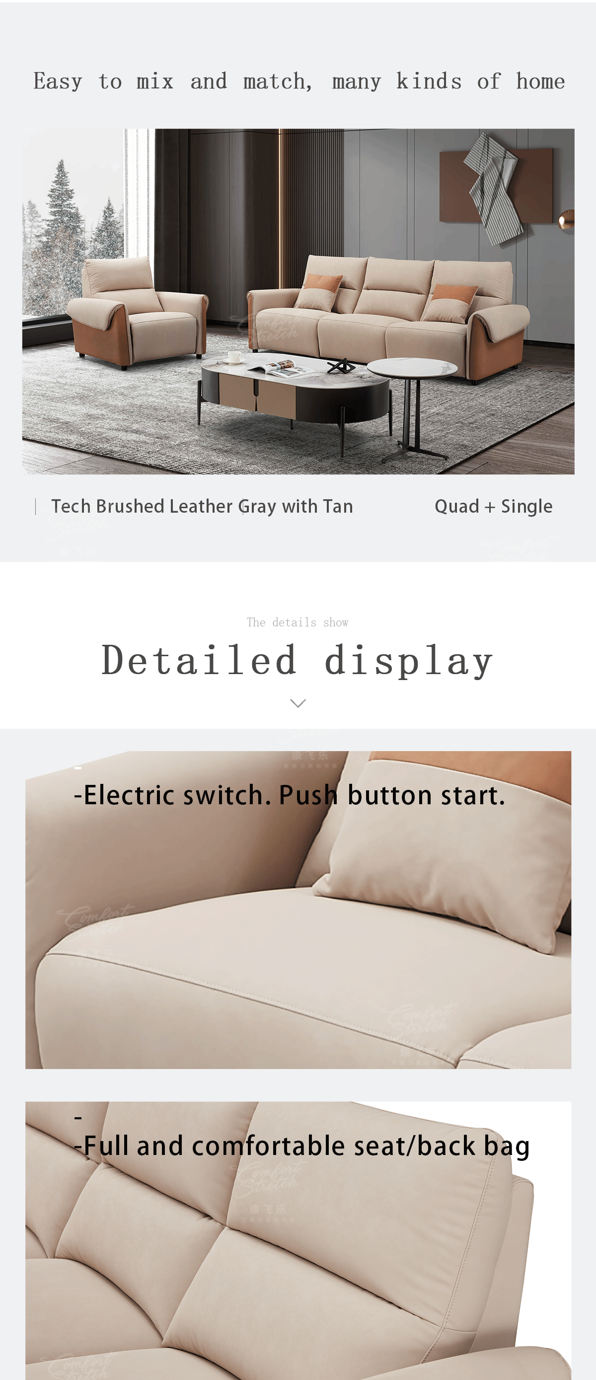 Indulge in style and relaxation. This sofa offers grey for 4 and light brown for 1. One touch to perfection.