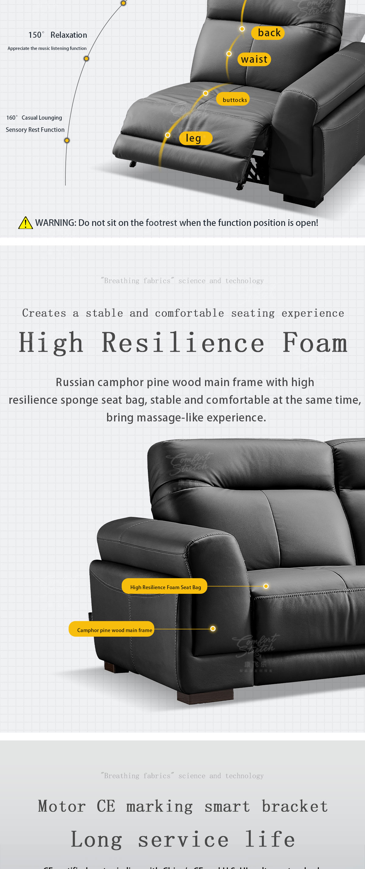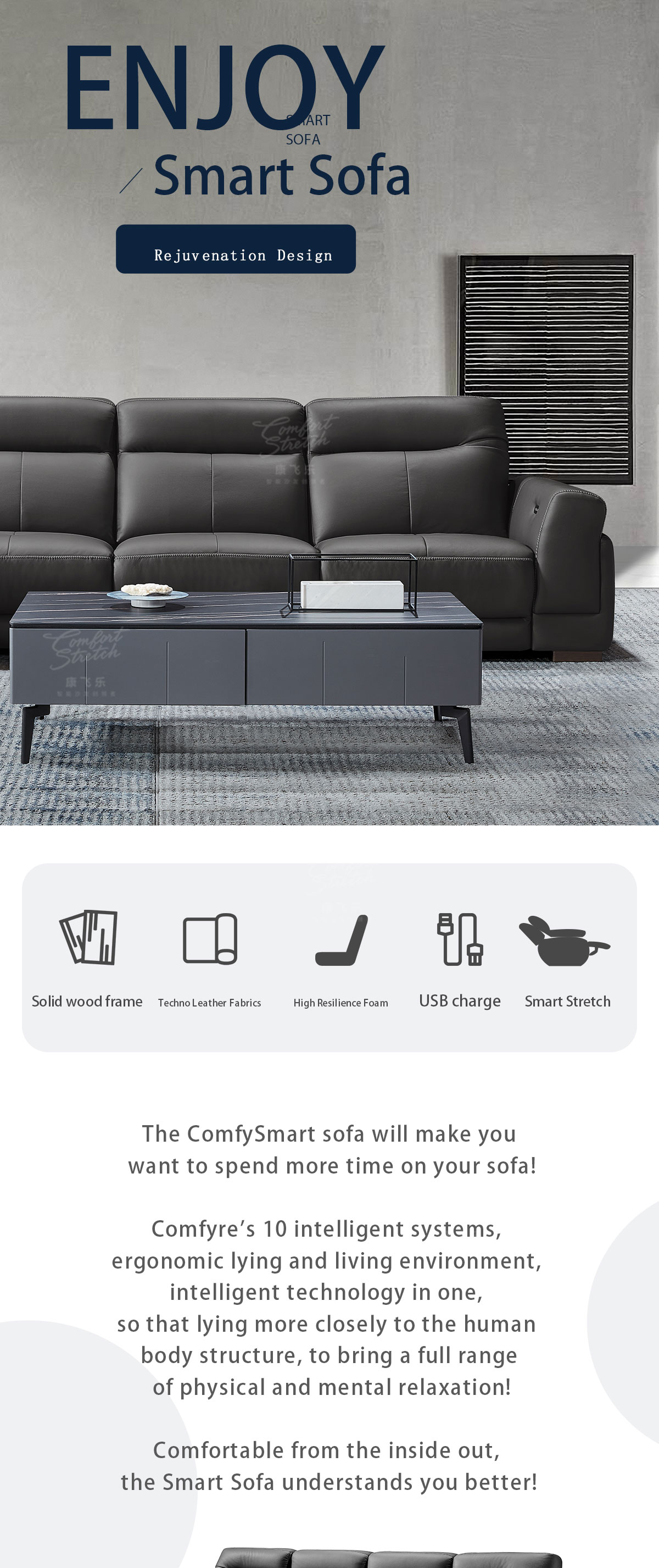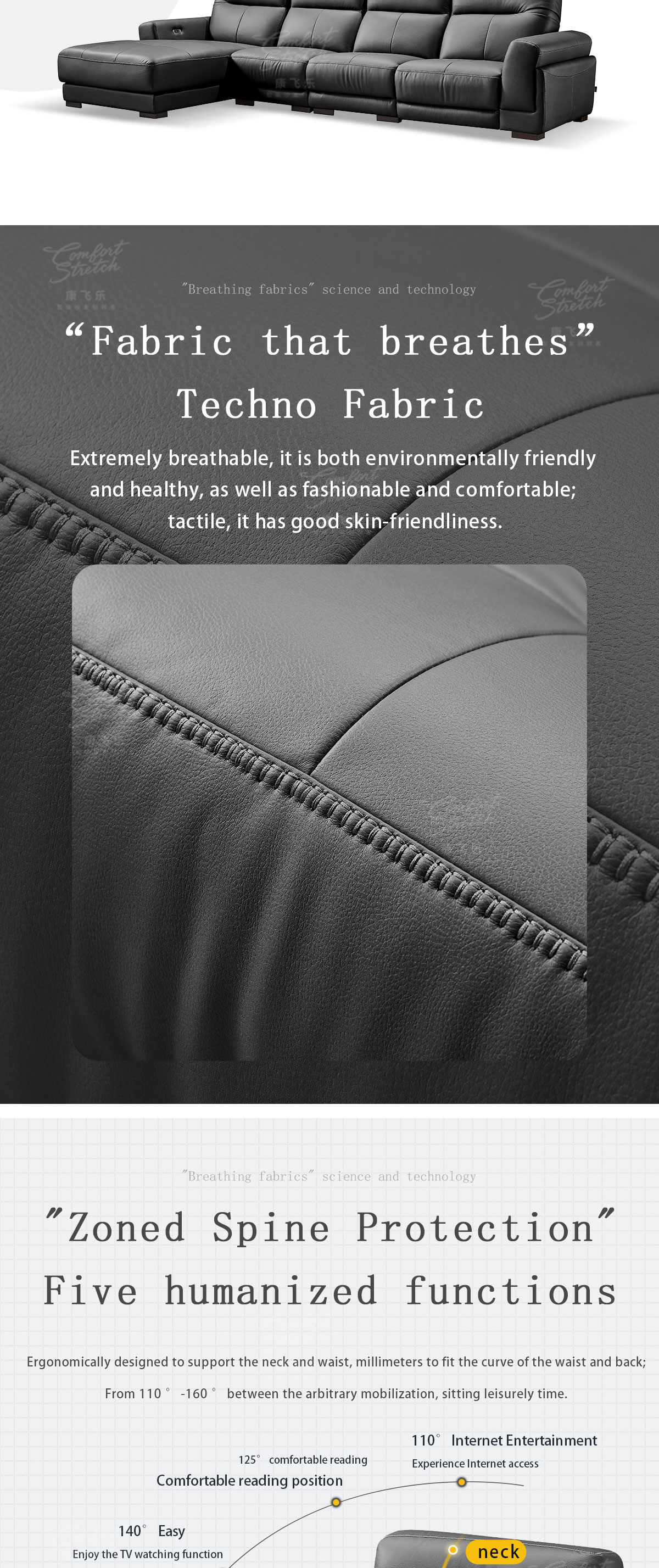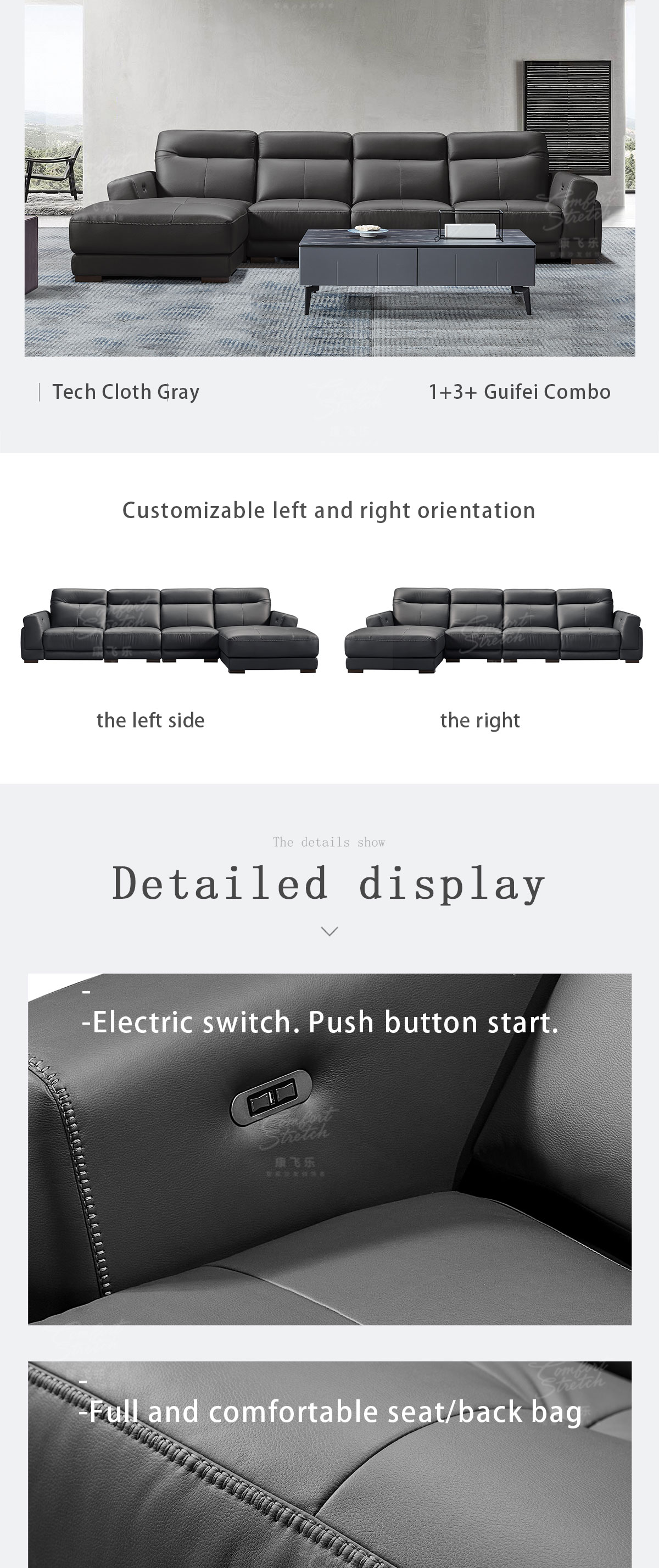 1. The sofa features a convenient push-button angle adjustment, allowing you to effortlessly transform your seating position to find the perfect relaxation spot. Whether you prefer to recline for a nap or sit upright for work or entertainment, it adapts to your needs with ease. 2. Filled with extremely soft high-density foam, it offers a plush and indulgent seating experience. The foam cushions your body, providing a cloud-like comfort that makes you reluctant to get up. 3. The solid wood internal frame is a testament to its durability. Crafted with precision and strength, it ensures the sofa can withstand daily use and remain a reliable piece of furniture for years to come. 4. With a built-in USB charging port, it adds a practical touch. You can keep your devices charged while lounging on the sofa, eliminating the need to search for an outlet or use extension cords. 5. The sofa is upholstered in stylish gray tech fabric, giving it a contemporary and fashionable appearance. The 1+3+extra seat configuration offers flexibility, accommodating different group sizes and usage scenarios, making it ideal for both intimate family moments and social gatherings.