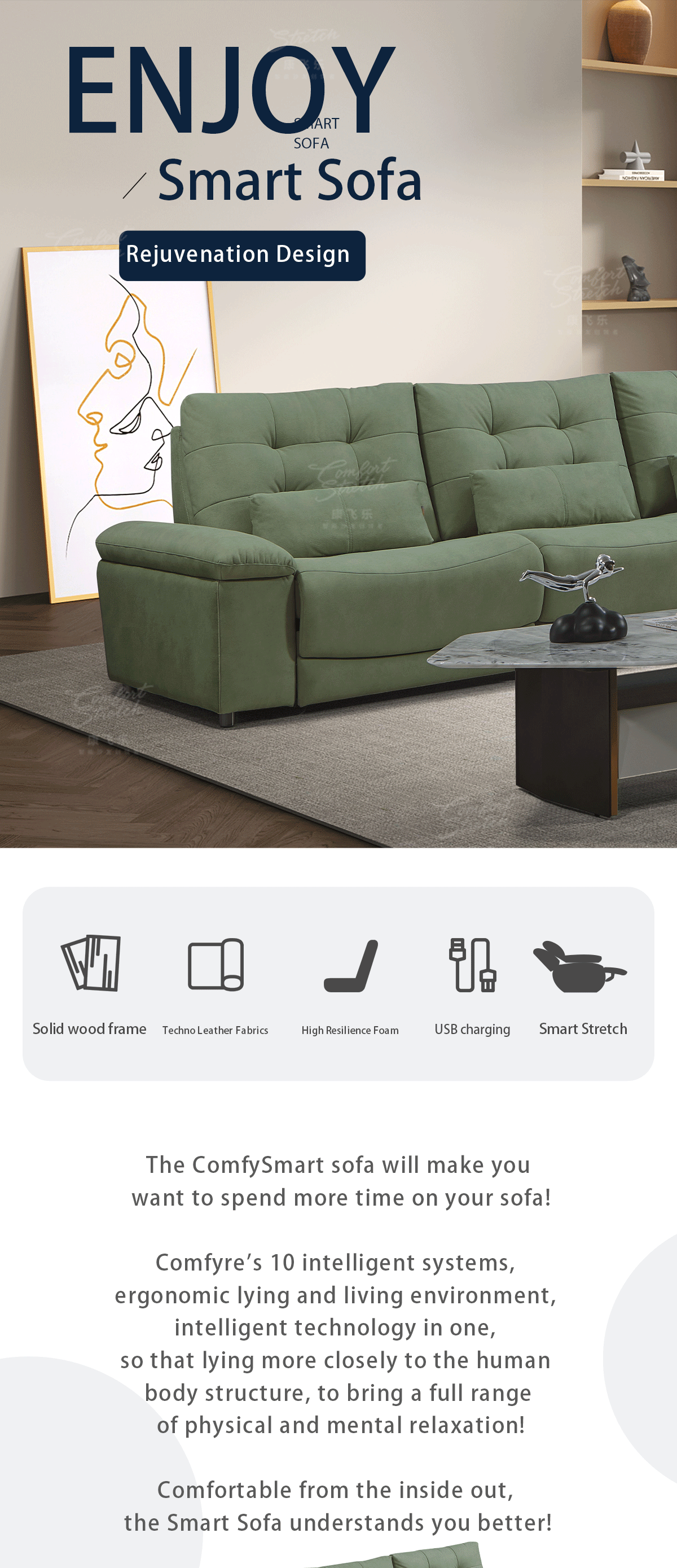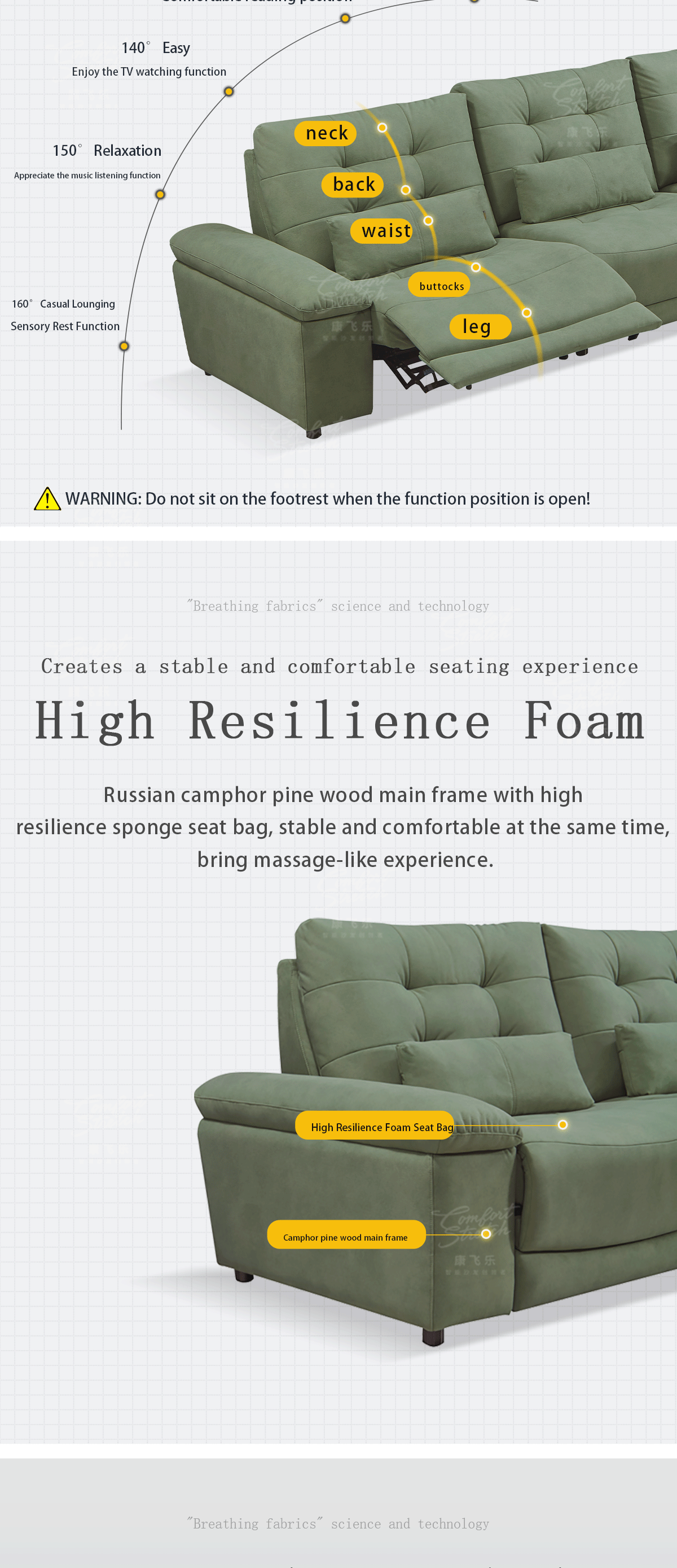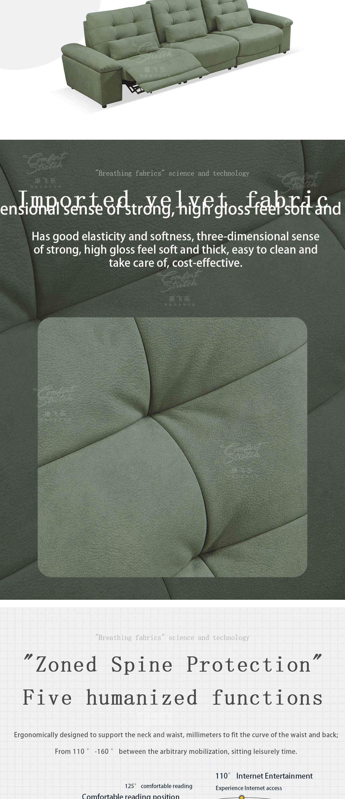 Modern smart sofa for ultimate comfort. One-button angle adjustment and high resilience foam. Solid wood and velvet for style and durability. Seats four in luxury!