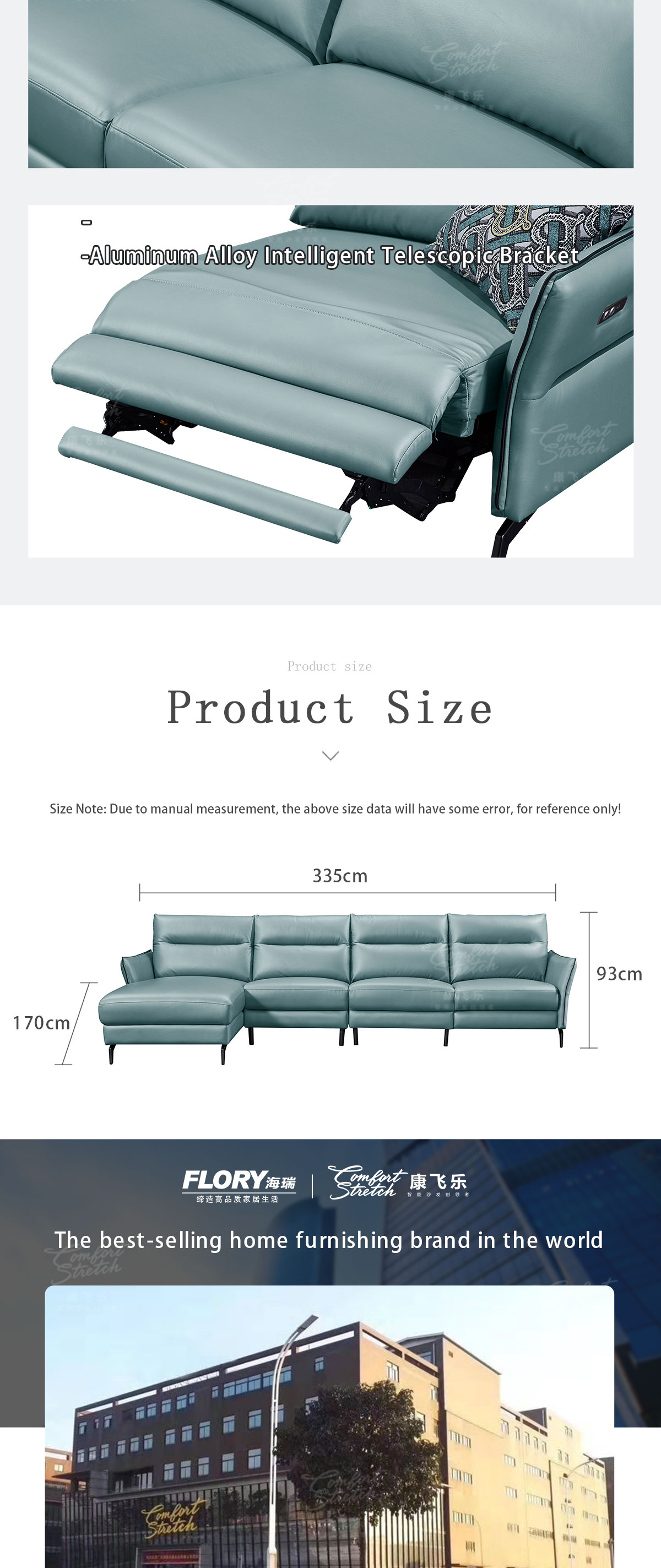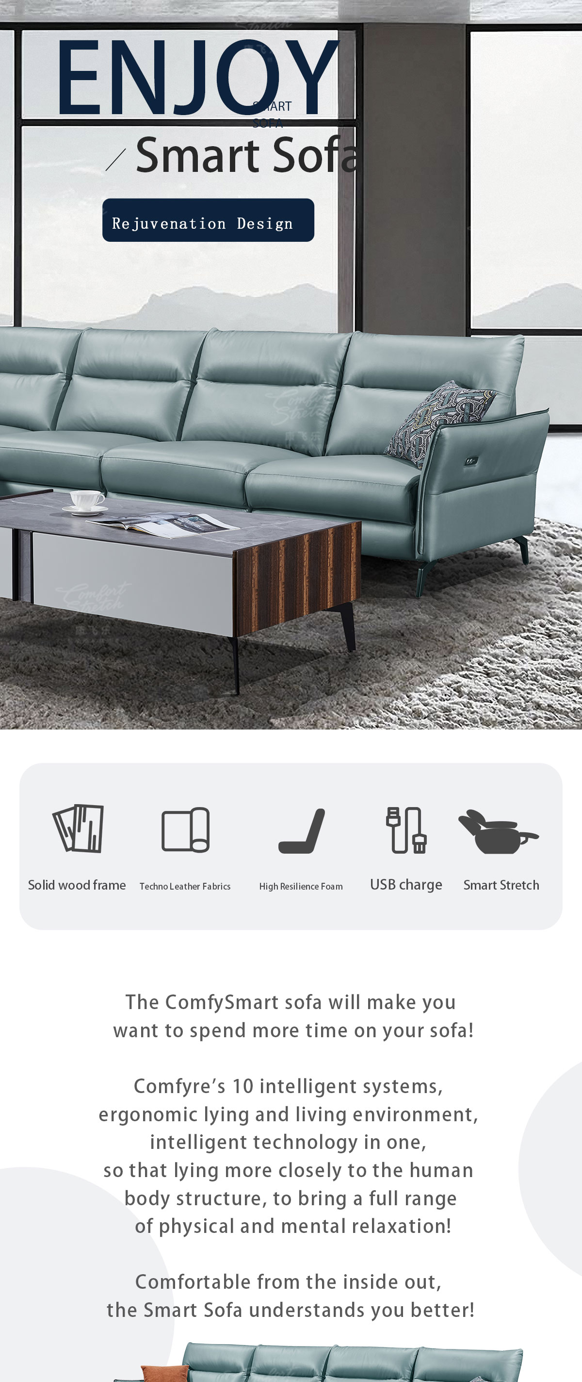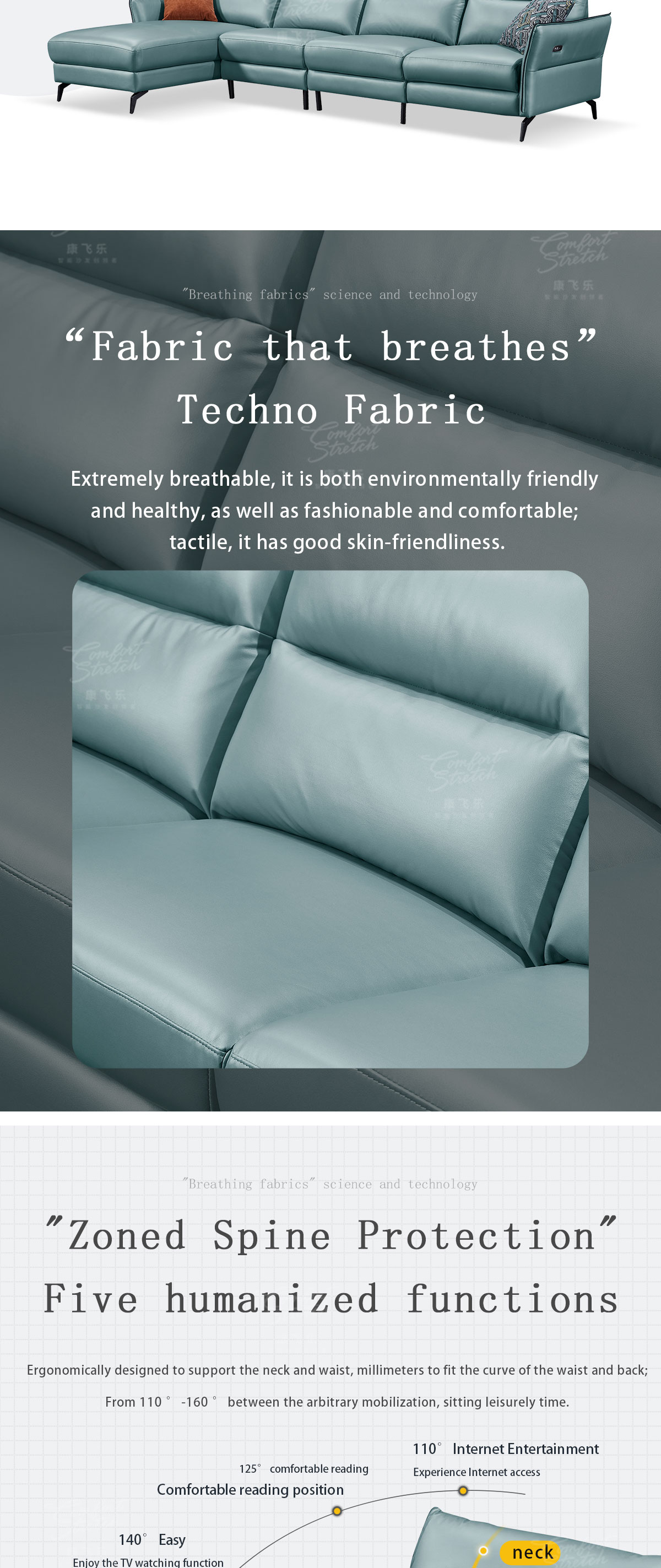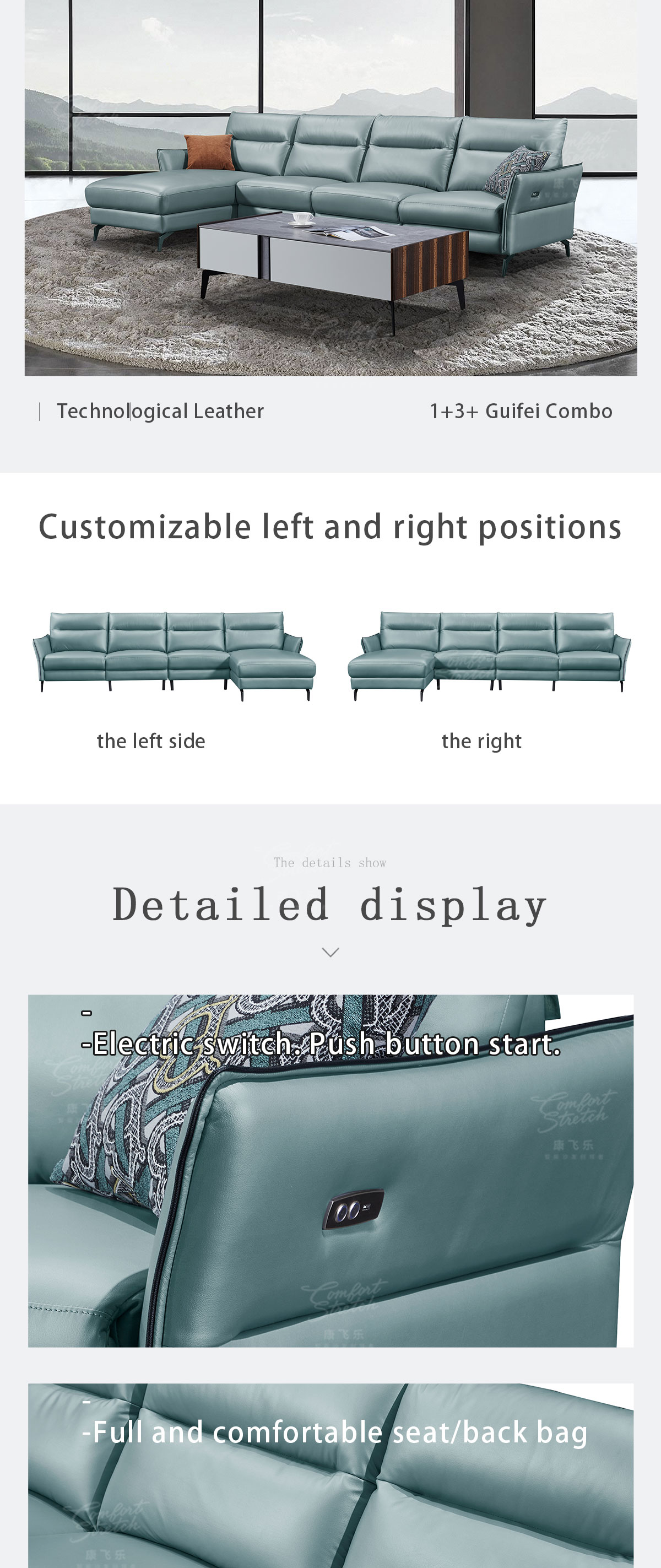1. This modern style smart sofa is a remarkable fusion of cutting-edge technology and exquisite craftsmanship. The push-button angle adjustment functionality is a game-changer, allowing you to effortlessly fine-tune your seating position for the ultimate relaxation. With just a simple press, you can transform your lounging experience to suit your mood and comfort preferences. 2. The inclusion of a USB charging port is a thoughtful addition that caters to the demands of our modern, connected lives. It ensures that your devices are always charged and ready to use, whether you're catching up on work or simply enjoying your favorite entertainment. 3. The fabric exterior of this sofa is a testament to superior craftsmanship. It is not only visually appealing but also feels luxurious to the touch. The carefully selected fabric adds a touch of elegance and sophistication to your living space, making the sofa a centerpiece that enhances the overall decor. 4. The 1+3+ extension positions offer unparalleled flexibility and seating options. Whether you're hosting a family gathering or enjoying a quiet evening alone, this sofa can be configured to meet your specific needs. It provides ample space for everyone to relax and unwind in comfort. 5. In summary, this smart sofa is not just a seating solution; it's a statement of style, comfort, and convenience. It's a piece of furniture that elevates your living experience, offering a perfect blend of form and function. It's an investment in quality and innovation that will bring years of enjoyment and satisfaction.