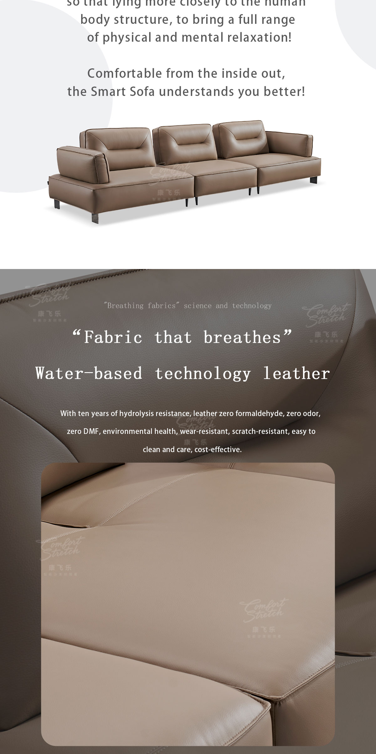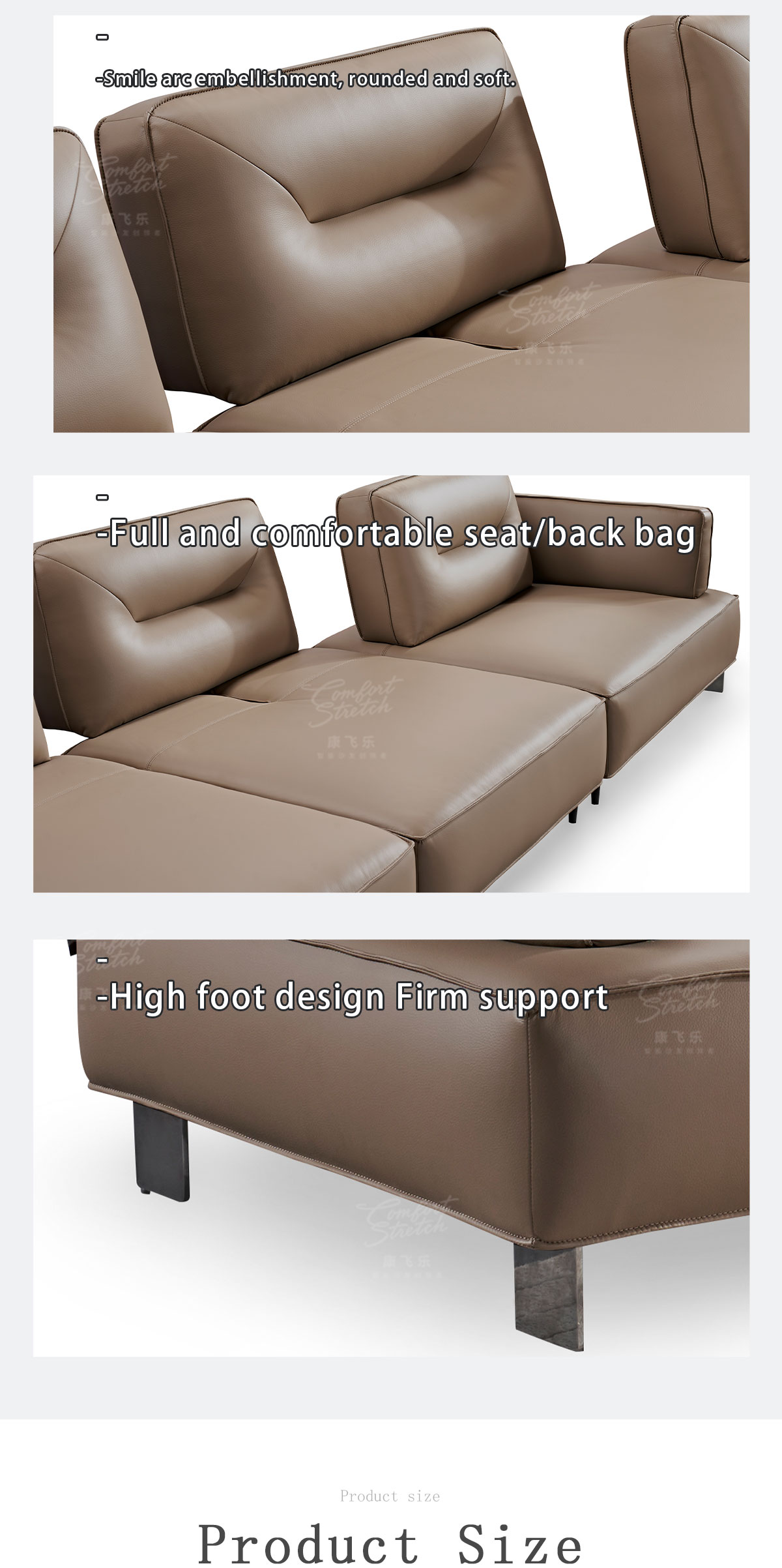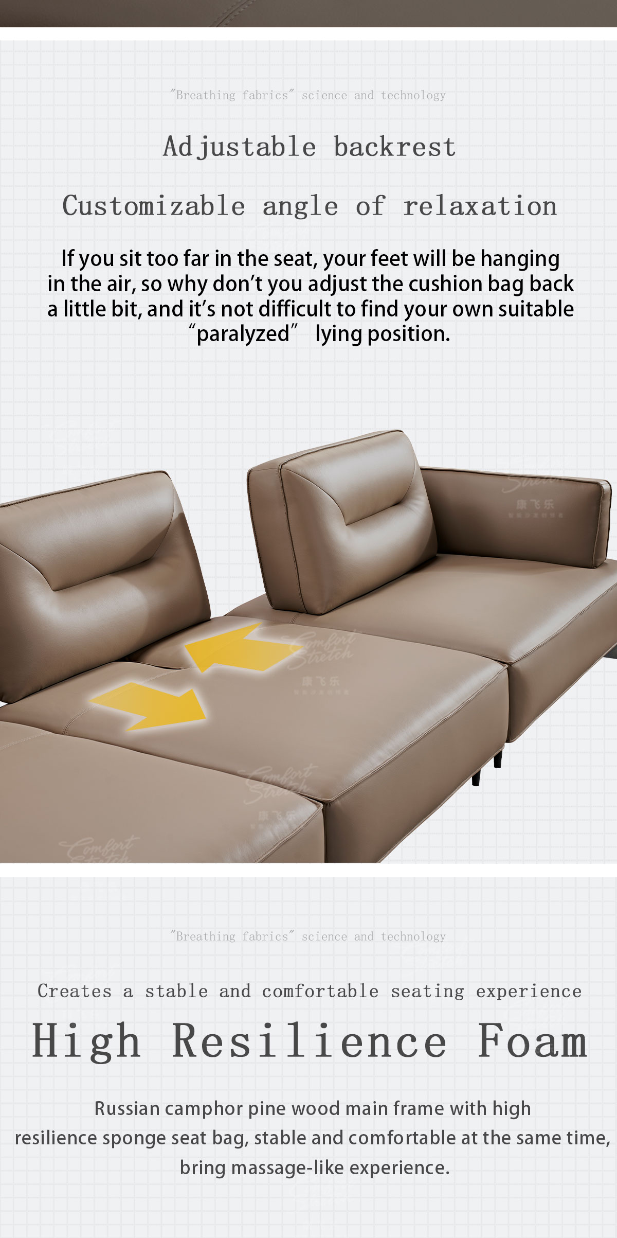 1. Experience ultimate relaxation with the effortless push-button angle adjustment. Seamlessly transform your seating position to suit your every whim and mood. Imagine effortlessly reclining after a hectic day or adjusting the angle for an enhanced viewing experience. 2. The high-density foam filling offers an indulgently soft and plush sensation. It envelops you in a cocoon of comfort, providing a luxurious seating experience that you'll constantly look forward to. 3. The solid wood interior frame ensures unrivaled durability and stability. Crafted with precision, it forms a robust foundation that can withstand the test of time and frequent use. 4. The sofa's exterior, crafted in the inviting caramel-colored tech leather, not only looks stylish and contemporary but also feels smooth and pleasant to the touch. 5. The inline four-seat configuration is perfect for family gatherings or social events, allowing four people to sit comfortably and enjoy each other's company.