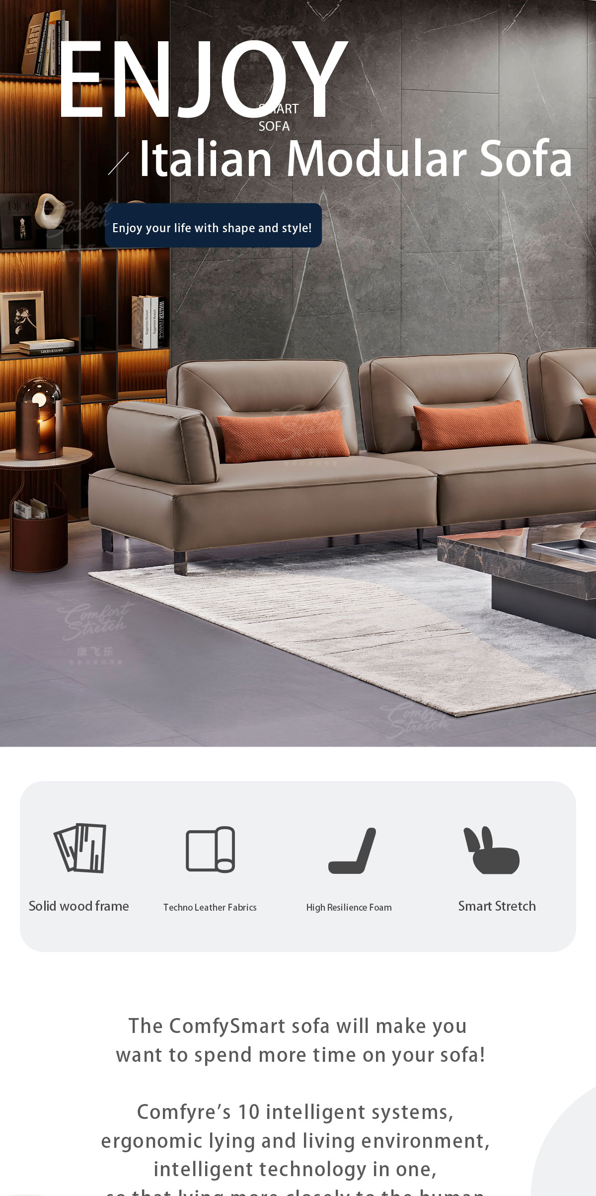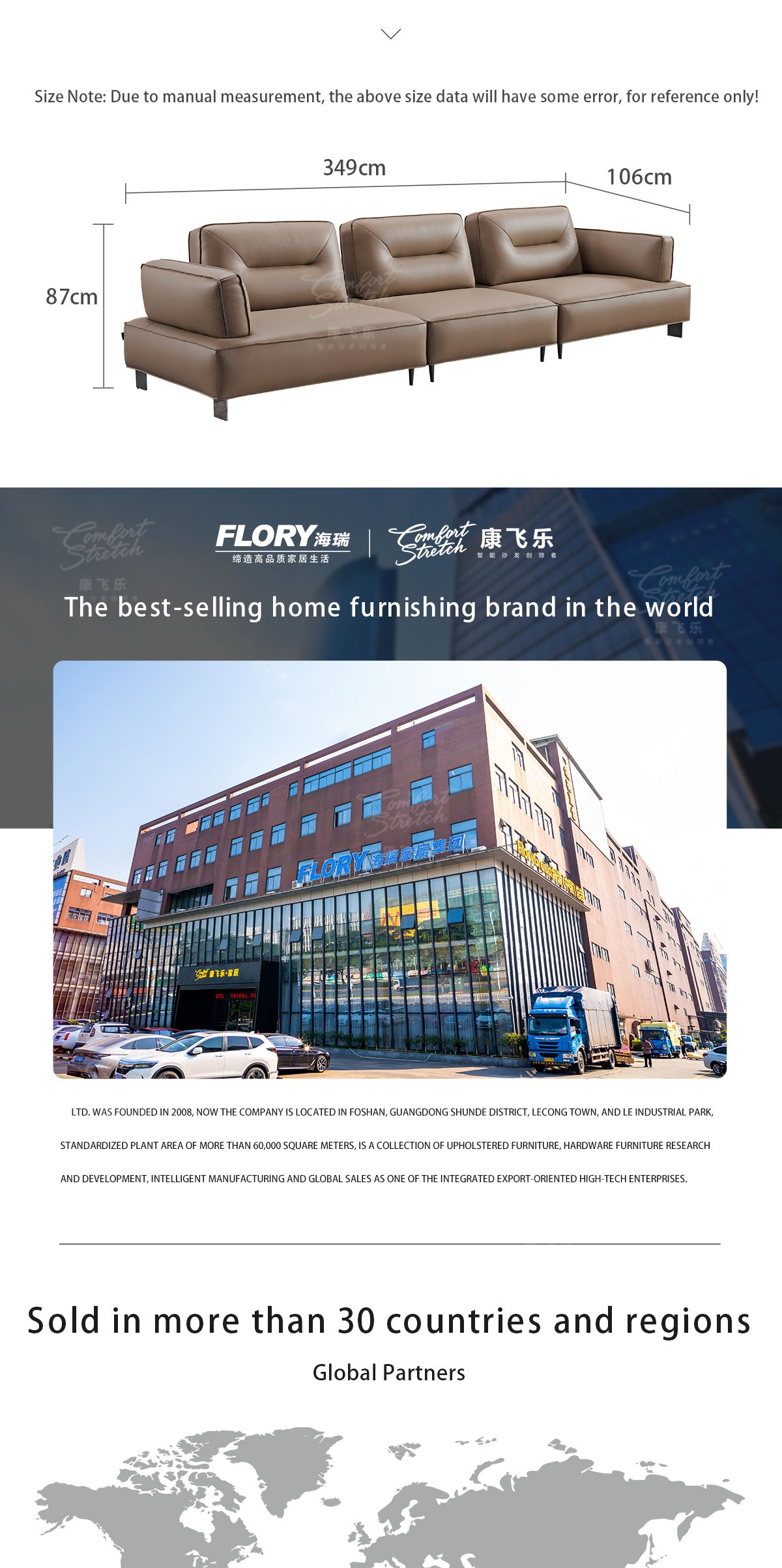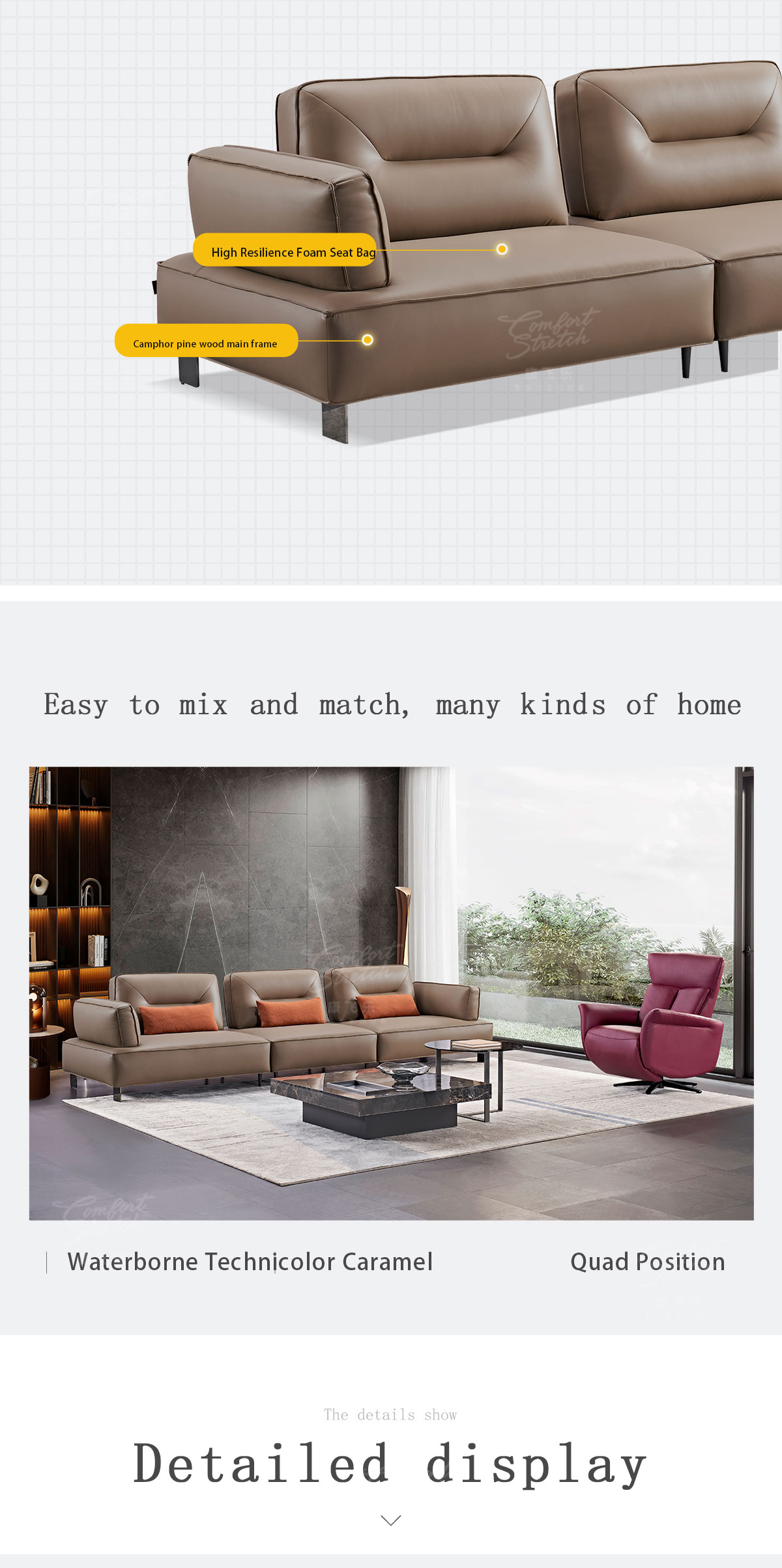 1. Experience ultimate relaxation with the effortless push-button angle adjustment. Seamlessly transform your seating position to suit your every whim and mood. Imagine effortlessly reclining after a hectic day or adjusting the angle for an enhanced viewing experience. 2. The high-density foam filling offers an indulgently soft and plush sensation. It envelops you in a cocoon of comfort, providing a luxurious seating experience that you'll constantly look forward to. 3. The solid wood interior frame ensures unrivaled durability and stability. Crafted with precision, it forms a robust foundation that can withstand the test of time and frequent use. 4. The sofa's exterior, crafted in the inviting caramel-colored tech leather, not only looks stylish and contemporary but also feels smooth and pleasant to the touch. 5. The inline four-seat configuration is perfect for family gatherings or social events, allowing four people to sit comfortably and enjoy each other's company.