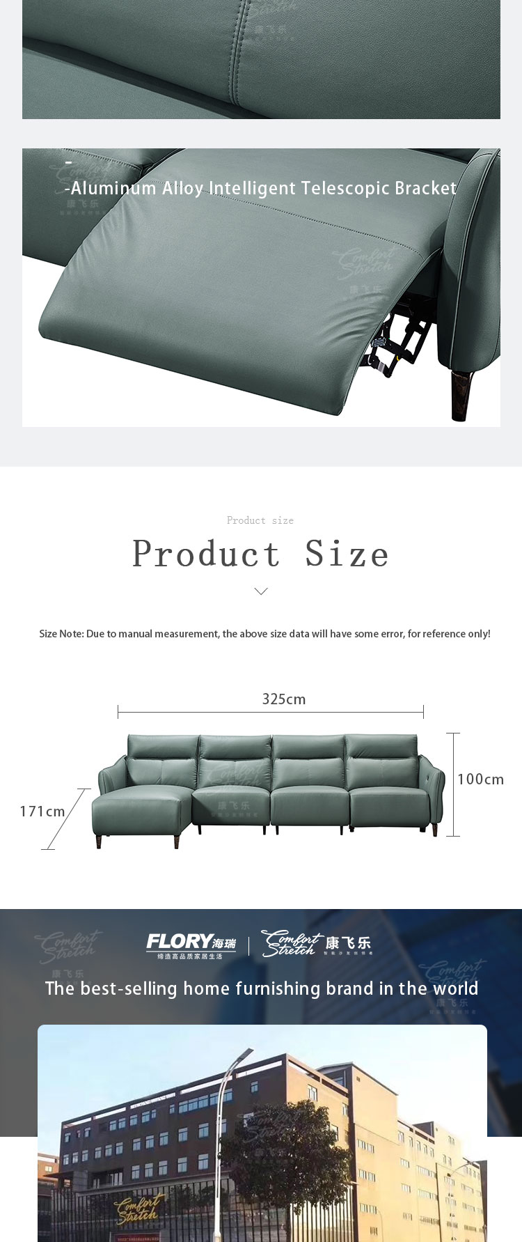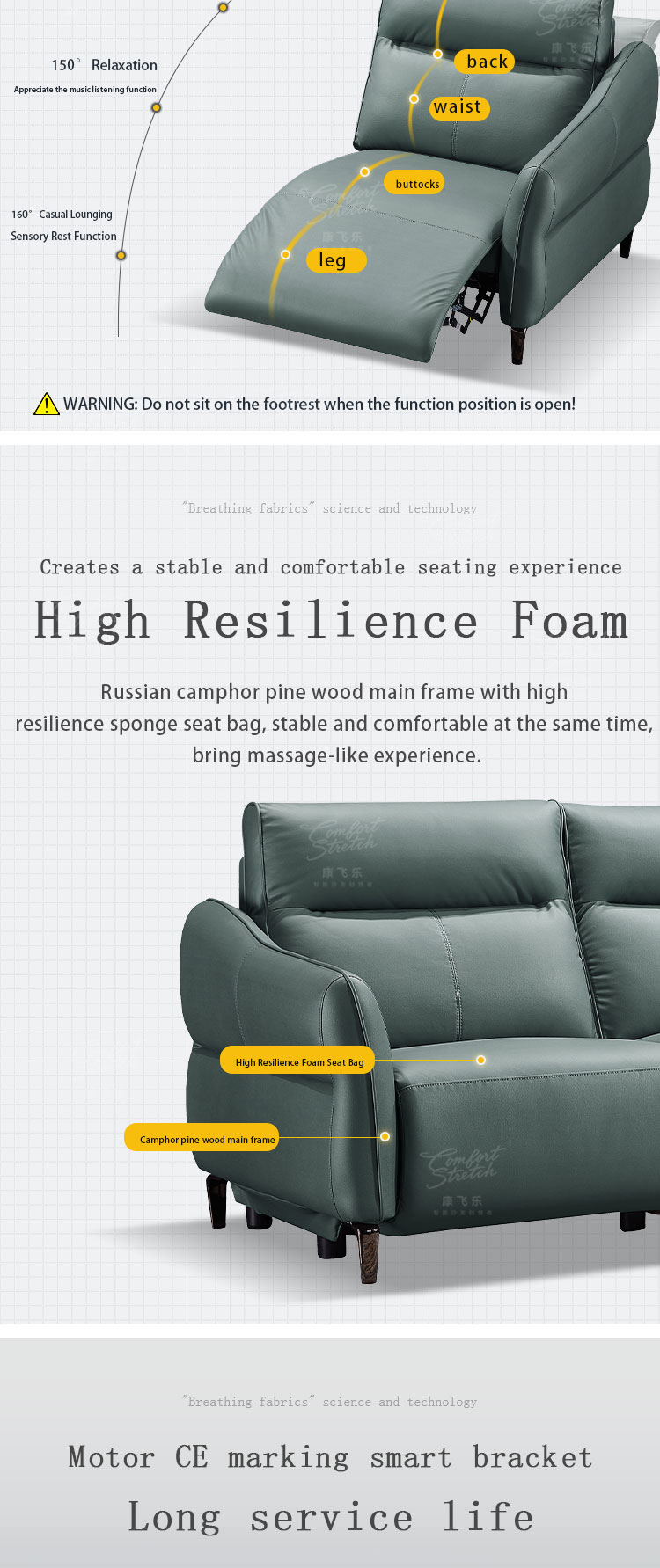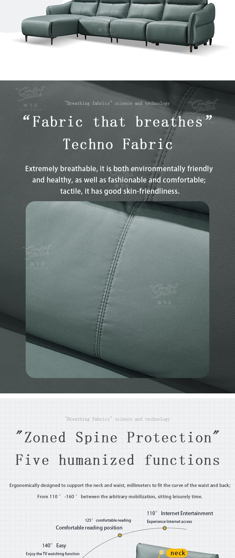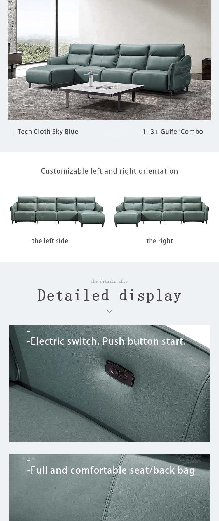 1. The push-button angle adjustment feature enables you to effortlessly customize your seating position. Whether you want to lounge and read a book or have a focused work session, this sofa adapts to your needs with ease. For example, you can recline the sofa fully to enjoy a movie or adjust it slightly for better posture while working. 2. Filled with extremely soft high-density foam, it offers a decadent and comfortable seating experience. The foam cushions your body, providing a level of softness that makes you feel like you're floating on a cloud. 3. The solid wood internal frame not only ensures durability but also provides a stable foundation. This means the sofa can handle daily use without any concerns of wobbling or structural issues. It's a reliable piece of furniture that will last for years. 4. The built-in USB charging port is a convenient addition. You can charge your phone, tablet, or other devices while relaxing on the sofa, eliminating the hassle of looking for an outlet or using a separate charger. 5. The sofa's sky blue tech fabric gives it a contemporary and inviting look. The 1-seater + 3-seater + extended seating configuration is highly versatile. It allows for different seating arrangements based on your specific needs, whether it's for a small family gathering or when you have guests over.